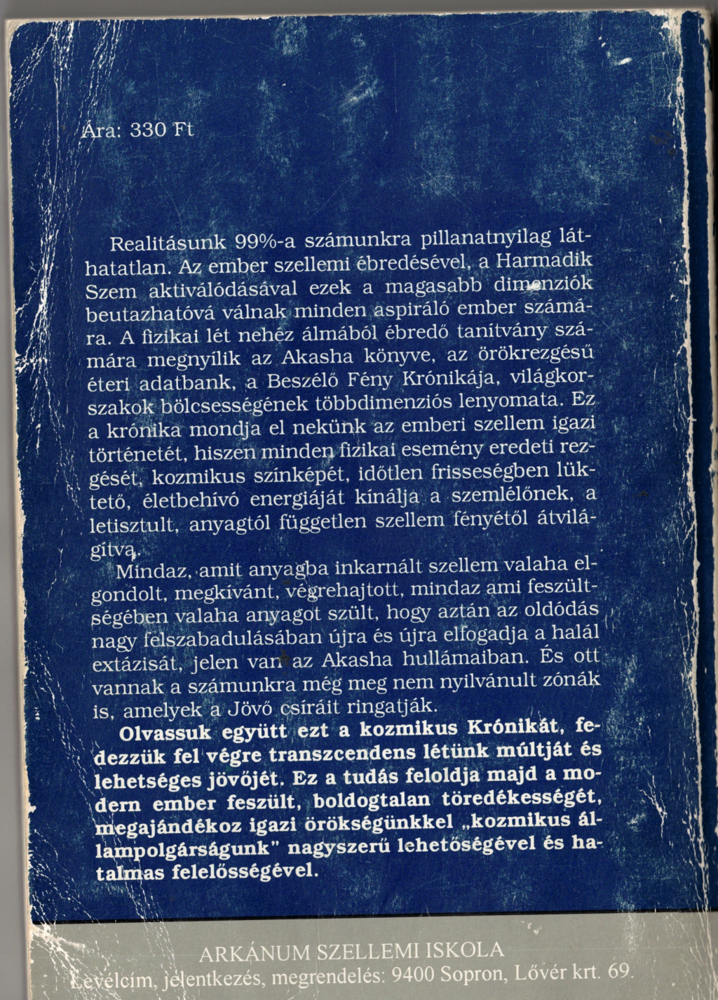 Realitásunk 99%-a számunkra pillanatnyilag láthatatlan. Az ember szellemi ébredésével, a Harmadik Szem aktiválódásával ezek a magasabb dimenziók beutazhatóvá válnak minden aspiráló ember számára. A fizikai lét nehéz álmából ébredő tanítvány számára megnyílik az Akasha könyve, az örökrezgésű éteri adatbank, a Beszélő Fény Krónikája, világkorszakok bölcsességének többdimenziós lenyomata. Ez a krónika mondja el nekünk az emberi szellem igazi történetét, hiszen minden fizikai esemény eredeti rezgését, kozmikus színképét, időtlen frissességben lüktető, életbehívó energiáját kínálja a szemlélőnek, a letisztult, anyagtól független szellem fényétől átvilágítva.