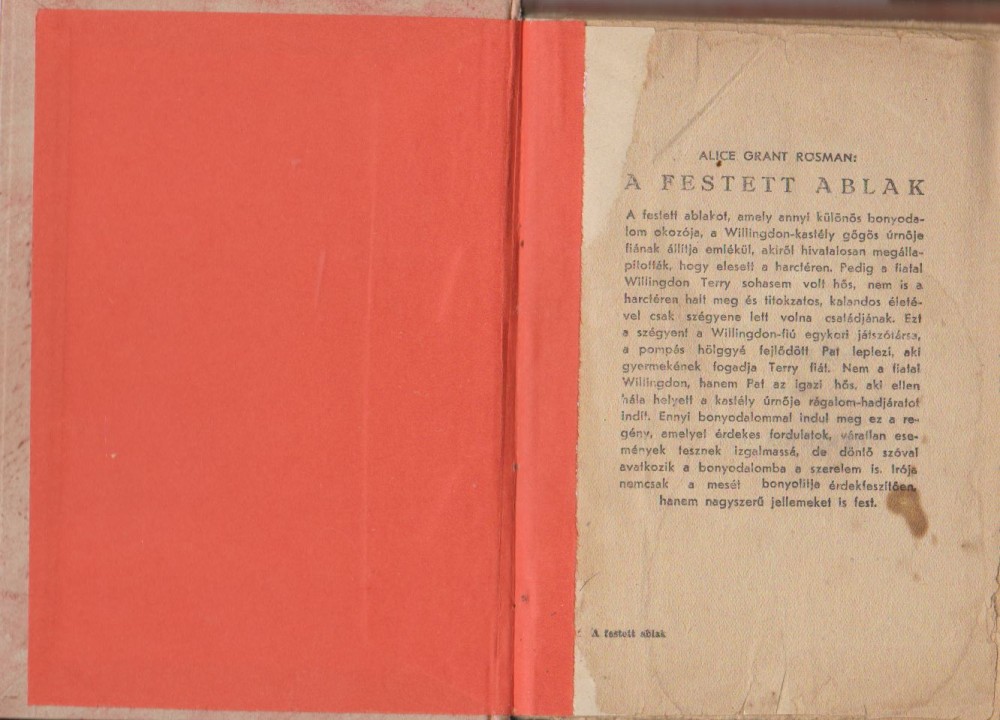 A festett ablakot, amely annyi különös bonyodalom okozója, a Willingdon-kastély gőgös úrnője fiának állítja emlékül, akiről hivatalosan megállapították, hogy elesett a harctéren. Pedig a fiatal Willingdon Terry sohasem volt hős, nem is a harctéren halt meg és titokzatos, kalandos életével csak szégyene lett volna családjának. Ezt a szégyent a Willingdon-fiú egykori játszótársa, a pompás hölggyé fejlődött Pat leplezi, aki gyermekének fogadja Terry fiát. Nem a fiatal Willingdon, hanem Pat az igazi hős, aki ellen hála helyett a kastély úrnője rágalom-hadjáratot indít. Ennyi bonyodalommal indul meg ez a regény, amelyet érdekes fordulatok, váratlan események tesznek izgalmassá, de döntő szóval avatkozik a bonyodalomba a szerelem is. Irója nemcsak a mesét bonyolítja érdekfeszítően, hanem nagyszerű jellemeket is fest.