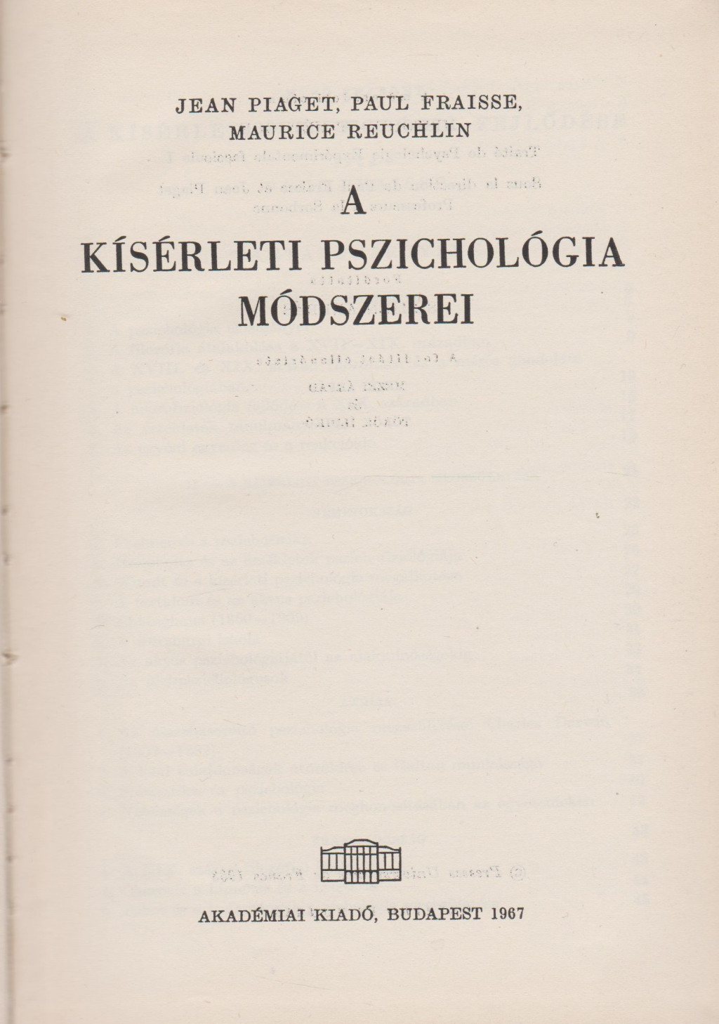 Szerző/Szerkesztő Jean Piaget, Paul Fraisse, Maurice ReuchlinKiadó Akadémiai KiadóKiadás helye BudapestKiadás éve 1967Fordító Semjén András; ell. Mezei Árpád, Török IldikóISBN 963-05-4028-2Nyomda Akadémiai Ny., BudapestOldalszám 262Nyelv magyarKötéstípus Vászon kiadói védőborítóbanÁllapot jó, hiányzik a védőborítójaRaktárkészlet VANCikkszám EE6_Piaget_1Tömeg 348 g/db