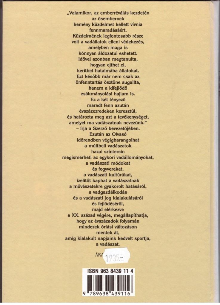 "Valamikor, az emberréválás kezdetén az ősembernek kemény küzdelmet kellett vívnia fennmaradásáért. Küzdelmének legfontosabb része volt a vadállatok elleni védekezés, amelyben maga is könnyen áldozatul eshetett. Idővel azonban megtanulta, hogy ejthet el, keríthet hatalmába állatokat. Ezt később már nem csak az önfenntartás ösztöne sugallta, hanem a kifejlődő zsákmányolási hajlam is. Ez a két tényező maradt fenn azután évszázezredeken keresztül, és határozta meg azt a tevékenységet, amelyet ma vadászatnak nevezünk." - írja a Szerző bevezetőjében. Ezután az Olvasó időrendben végigbarangolhat a múltbeli vadászatok hazai színterein megismerheti az egykori vadállományokat, a vadászati módokat és fegyvereket, a vadászati kultúrákat, ízelítőt kaphat a vadászatnak a művészetekre gyakorolt hatásáról, a vadgazdálkodás és a vadászati jog kialakulásáról és fejlődéséről, majd elérkezve a XX. század végére, megállapíthatja, hogy az évszázadok folyamán mindezek óriási változáson mentek át, amíg kialakult napjaink kedvelt sportja, a vadászat.