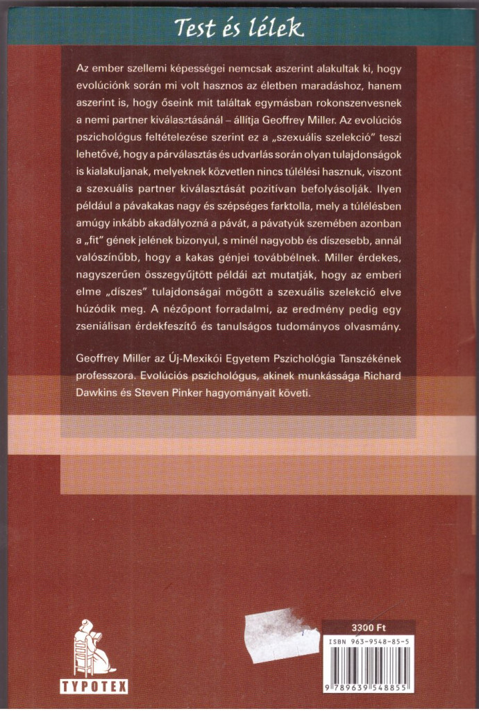 Az ember szellemi képességei nemcsak aszerint alakultak ki, hogy evolúciónk során mi volt hasznos az életben maradáshoz, hanem aszerint is, hogy őseink mit találtak egymásban rokonszenvesnek a nemi partner kiválasztásánál - állítja Geoffrey Miller. Az evolúciós pszichológus feltételezése szerint ez a "szexuális szelekció" teszi lehetővé, hogy a párválasztás és udvarlás során olyan tulajdonságok is kialakuljanak, melyeknek közvetlen nincs túlélési hasznuk, viszont a szexuális partner kiválasztását pozitívan befolyásolják. Ilyen például a pávakakas nagy és szépséges farktolla, mely a túlélésben amúgy inkább akadályozná a pávát, a pávatyúk szemében azonban a "fit" gének jelének bizonyul, s minél nagyobb és díszesebb, annál valószínűbb, hogy a kakas génjei továbbélnek. Miller érdekes, nagyszerűen összegyűjtött példái azt mutatják, hogy az emberi elme "díszes" tulajdonságai mögött a szexuális szelekció elve húzódik meg. A nézőpont forradalmi, az eredmény pedig egy zseniálisan érdekfeszítő és tanulságos tudományos olvasmány.