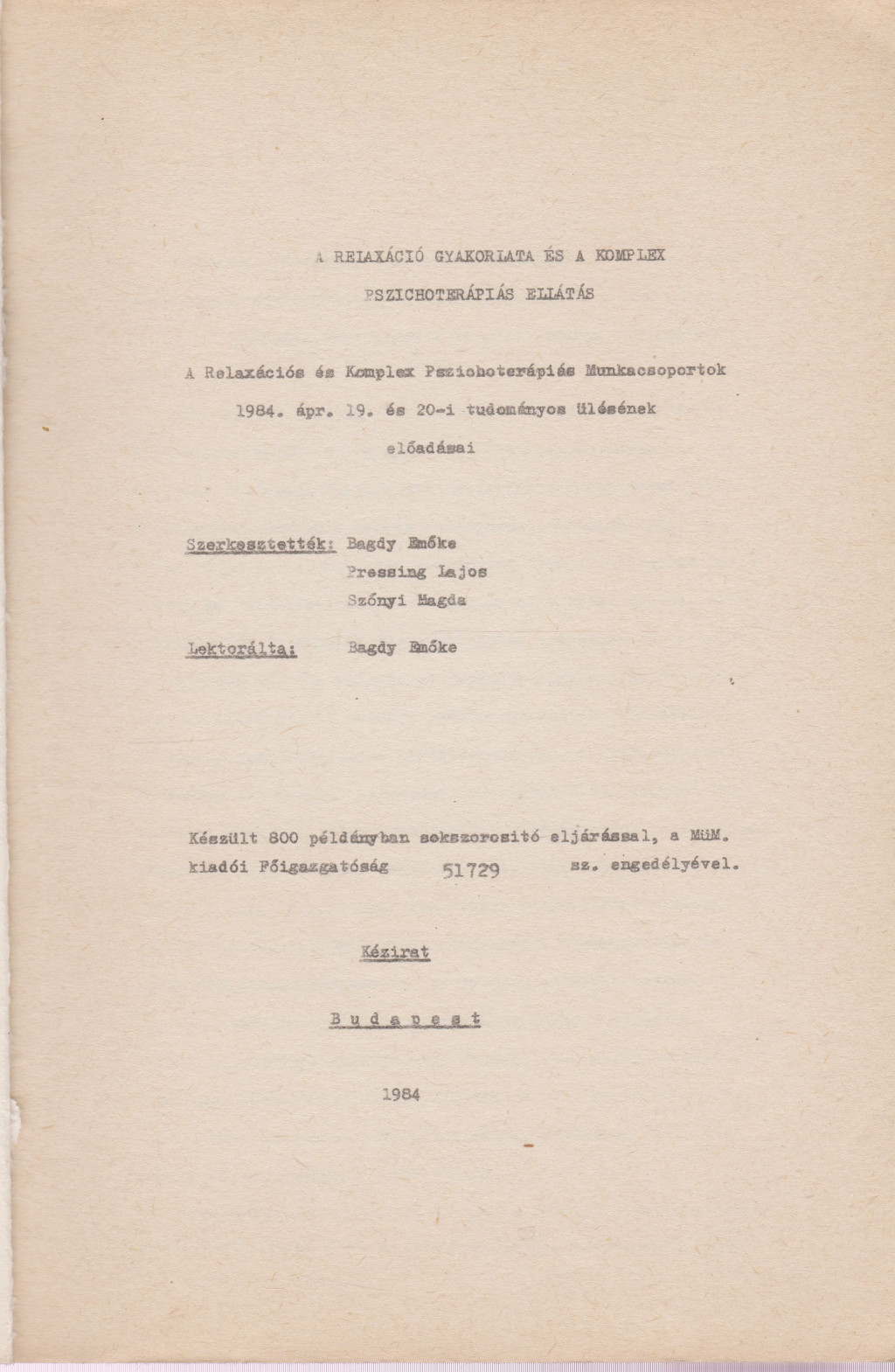 Alcím A Relaxációs és Komplex Pszichoterápiás Munkacsoportok 1984. ápr. 19. és 20-i tudományos ülésének előadásaiSzerző/Szerkesztő Bagdy Emőke, Pressing Lajos, Szőnyi Magda (szerk.)Kiadó [kézirat]Kiadás helye BudapestKiadás éve 1984Oldalszám 250Nyelv magyarKötéstípus Ragasztott papírkötésÁllapot jóRaktárkészlet VANCikkszám EE6_BagdyTömeg 326 g/db
