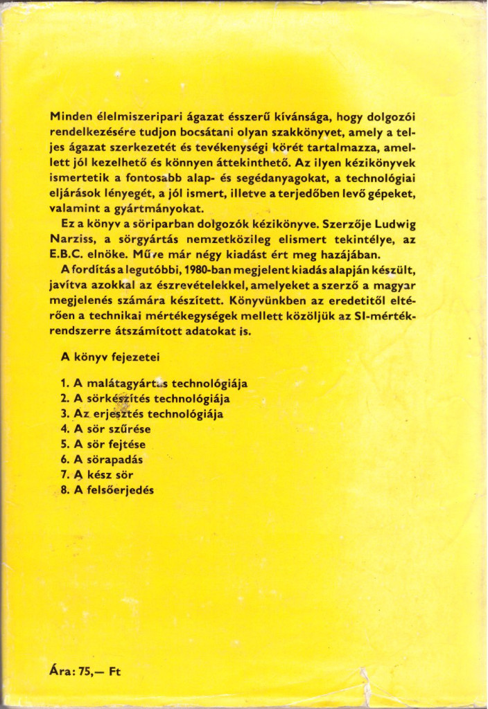 Ez a könyv a söriparban dolgozók kézikönyve. Szerzője Ludwig Narziss, a sörgyártás nemzetközileg elismert tekintélye, az E. B. C. elnöke. Műve már négy kiadást ért meg hazájában.