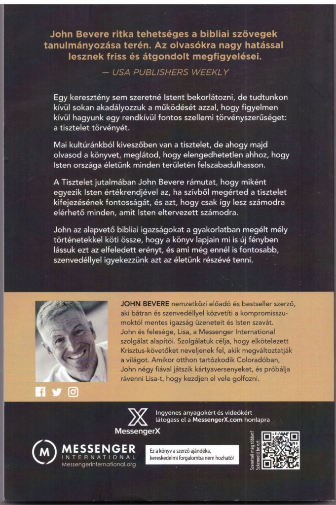A Tisztelet jutalmában John Bevere rámutat, hogy miként egyezik Isten értékrendjével az, ha szívből megérted a tisztelet kifejezésének fontosságát, és azt, ha szívből megérted a tisztelet kifejezésének fontosságát, és azt, hogy csak így lesz számodra elérhető minden, amit Isten eltervezett számodra.