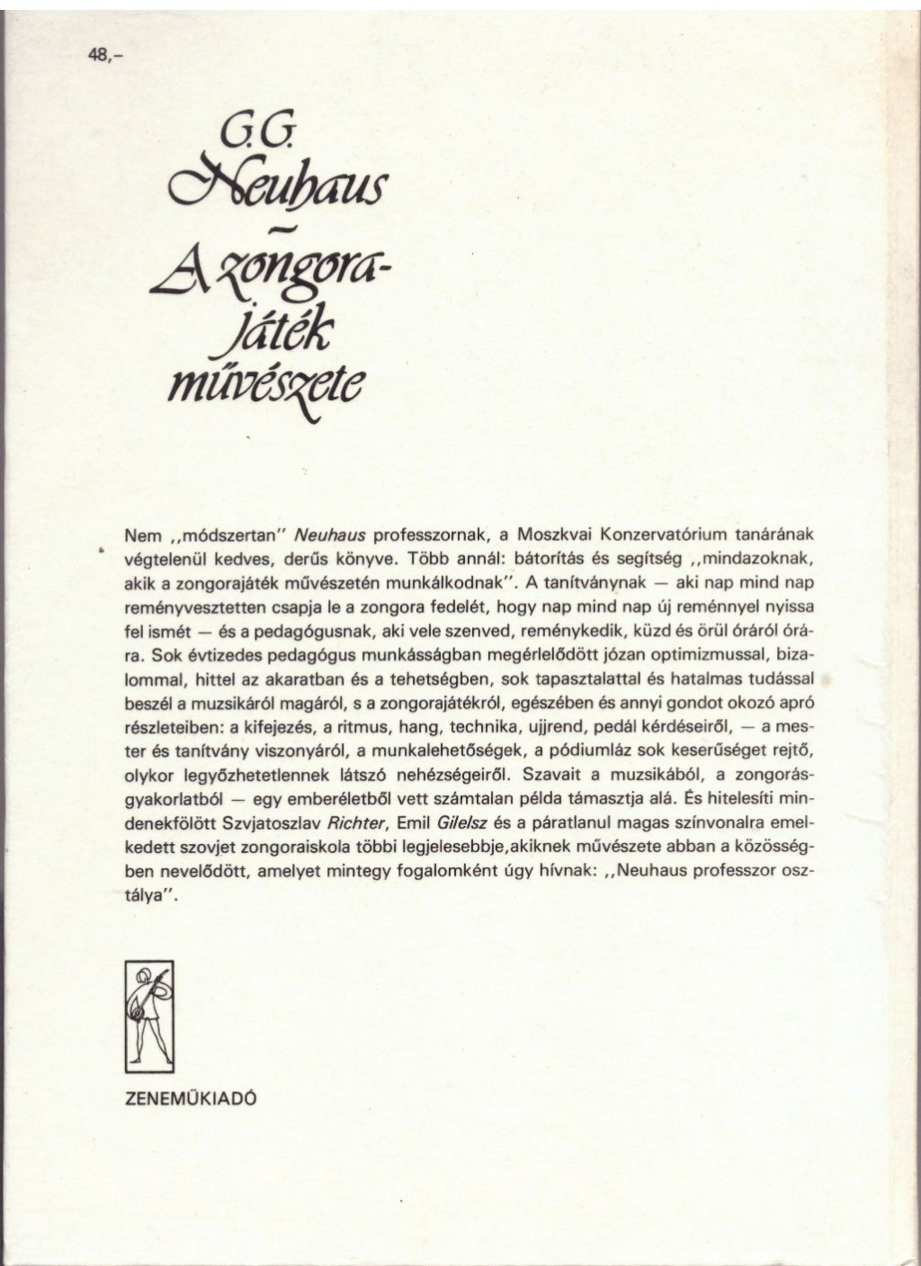 Alcím Egy pedagógus feljegyzéseiSzerző/Szerkesztő G. G. NeuhausKiadó ZeneműkiadóKiadás helye BudapestKiadás éve 1985Kiadásjelzés Második, változatlan kiadás.Fordító Legány DezsőISBN 963 330 522 5Nyomda ZeneműnyomdaOldalszám 176Nyelv MagyarRaktárkészlet VANCikkszám P_8_5_PIANOARTTömeg 395 g/db