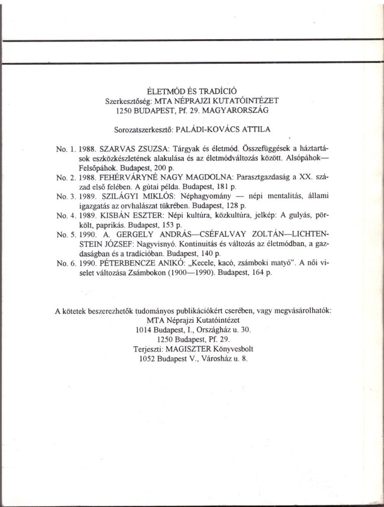 Alcím Történeti és Néprajzi dolgozatokSzerző/Szerkesztő Hála JózsefKiadó Magyar Tudományos Akadémia Néprajzi KutatóintézetKiadás helye BudapestKiadás éve 1995Sorozat Életmód és tradíció 7.ISBN 963 567 000 1Nyomda Neotipp nyomda BudapestOldalszám 400Nyelv MagyarKötéstípus ragasztott puha papírkötésÁllapot JóRaktárkészlet VANCikkszám NEPRAJZKOZETTömeg 650 g/db