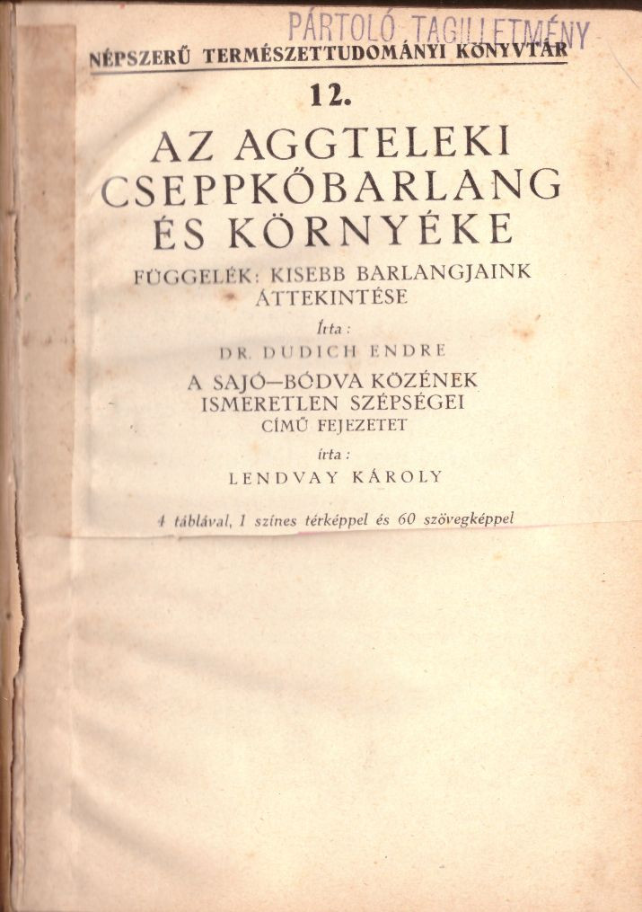 Mily gyakran halljuk, olvassuk és érezzük annak a szemrehányásnak igazságát: nem ismerjük, nem becsüljük eléggé hazánk természeti szépségeit. Bejárjuk, megcsodáljuk a külföldet és közömbösen haladunk el szülőföldünk kincsei mellett. Vajjon nem ezzel a vétkes közömbösséggel magyarázható-e az, hogy kerek 100 esztendővel ezelőtt jelent meg az Aggteleki-barlangnak - ennek a világcsodának, mely még ma is Európa negyedik leghosszabb barlangja - első és utolsó kimerítő leírása, Vass Imre, Gömör-Kishont vármegye néhai földmérőjének tollából! Ma, amikor pedagógusaink a honismertetés léleknevelő, a turisztika testnevelő hatásait lépten-nyomon hangsúlyozzák, hálás feladatra vállalkozott Dudich Endre, a barlang kitűnő ismerője, alapos, a barlang keletkezésére, történetére, egész természetrajzára részletesen kiterjedő leírásával. Hosszú évek mélyreható és szeretetteljes kutatásainak eredményeit találja meg az olvasó ebben a népszerű füzetben, mely tulajdonképen egy a szerzőnek német nyelven megjelent tudományos monográfiáját teszi a művelt magyar közönség számára is élvezetes formában hozzáférhetővé. A barlang közvetlen környékének, a Sajó-Bódva közének ismeretlen szépségeit Lendvay Károly tárja fel, vándorlásra csábító leírásaival és eredeti fényképfelvételeivel.