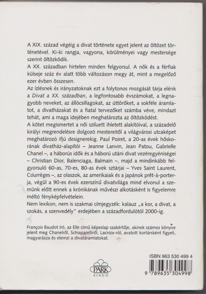 Szerző/Szerkesztő François BaudotKiadó Park KiadóKiadás helye BudapestKiadás éve 2000Fordító Gortvai KatalinIllusztrátor/fotós Képszerkesztés: Delphine Pietri, Géraldine Drevon-BalasISBN 963 530 499 4Nyomda Printed in ItalyOldalszám 400Nyelv magyarKötéstípus ragasztott puha papírkötésÁllapot Jó, ceruzás aláhúzások néhány helyen.Raktárkészlet VANCikkszám FASHION20Tömeg 990 g/db