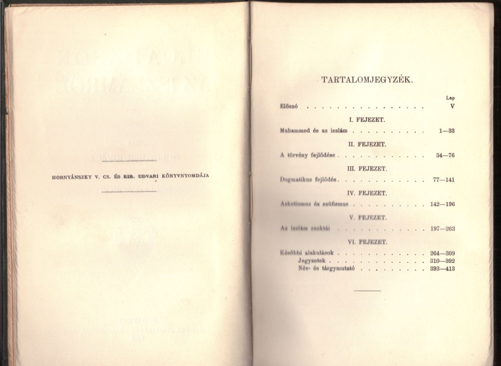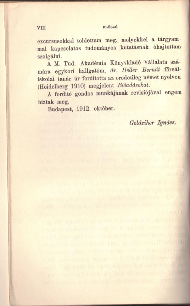 Dolgozatomat ismerő néhány szaktársam jóakaró biztatása megkönnyítette azt az elhatározásomat, hogy eredeti rendeltetése szerint angol fordításra szánt kéziratomat Winter Károly heidelbergi egyetemi könyvkereskedésének a tőle megindított „Religionswissenschaftliche Bibliothek" 1. számául Vorlesungen über den Islam czímmel átengedjem. Az Előadások szerkezetén és berendezésén alig tettem változtatást; csak az egyes fejezetekhez függesztett jegyzetekkel és excursusokkal toldottam meg, melyekkel a tárgyammal kapcsolatos tudományos kutatásnak óhajtottam szolgálni.