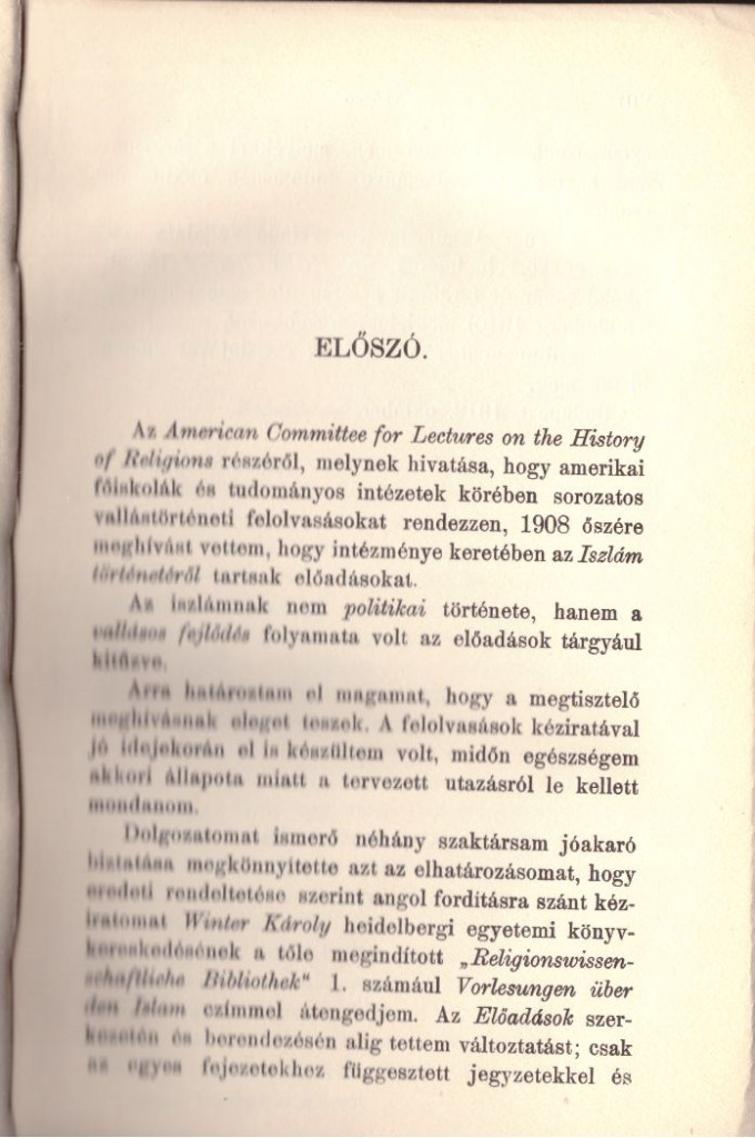 Az American Committee for Lectures on the History of Religions részéről, melynek hivatása, hogy amerikai főiskolák és tudományos intézetek körében sorozatos vallástörténeti felolvasásokat rendezzen, 1908 őszére meghívást vettem, hogy intézménye keretében az Iszlám történetéről tartsak előadásokat.