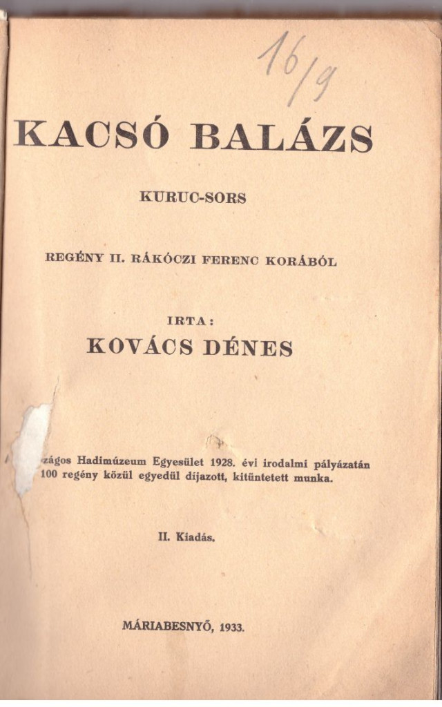 Alcím Kuruc-sors/Regény II. Rákóczi Ferenc korábólSzerző/Szerkesztő Kovács DénesKiadó Az Országos Hadimúzeum EgyesületKiadás helye MáriabesnyőKiadás éve 1933Kiadásjelzés Az Országos Hadimúzeum Egyesület 1928. évi irodalmi pályázatán 100 regény közül egyedül díjazott, kitüntetett munka. II. kiadás. Nyomatott Fischer Lajos könyvnyomdájában, Sárospatakon.Nyomda Nyomatott Fischer Lajos könyvnyomdájában, Sárospatakon.Oldalszám 164Nyelv MagyarKötéstípus Varrott papírkötésÁllapot Közepes, az előzéklapon az előző tulajdonos jegyzetével, és bélyegzővel.Raktárkészlet VANCikkszám P_KACSOBStátusz ÚJ  Tömeg 180 g/db