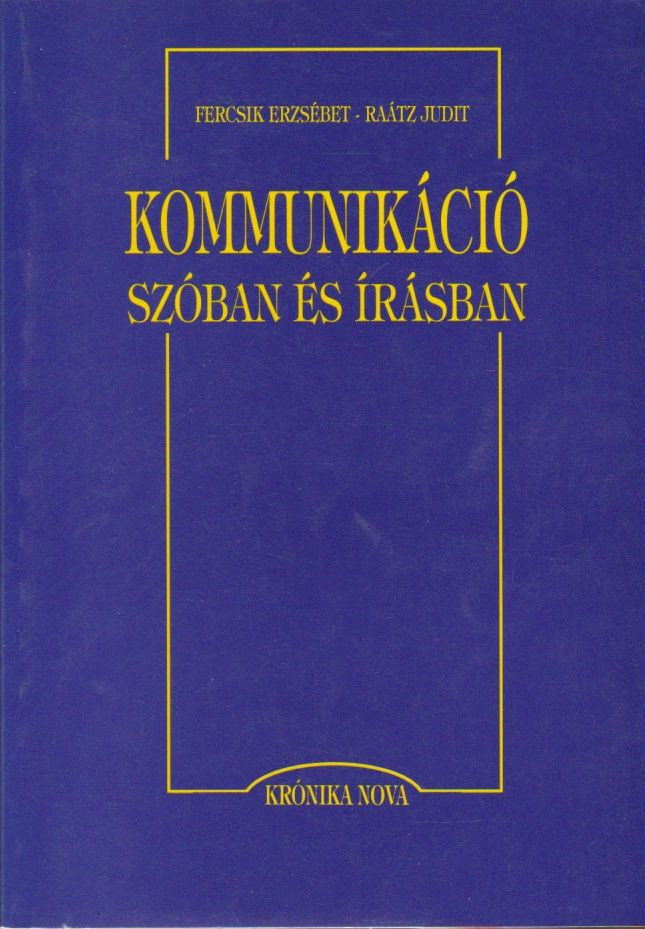 Bevezető 7 Mi a kommunikáció? (Raátz Judit) 9 Feladatok 11 Irodalom 11 A nyelvi kommunikáció (Raátz Judit) 12 A nyelvi kommunikáció kutatásának története 12 Feladatok 14 A beszédaktus-elméletéről 16 Feladatok 17 A kommunikáció alaptételei 18 Feladatok 19 A kommunikáció típusai 20 Feladatok 20 A kommunikáció csatornái 21 Feladatok 22 Irodalom 23 A nem verbális jelek (Raátz Judit) 24 A nem verbális jelek szerepe a kommunikáció folyamatában 24 Feladatok 25 A nem verbális kommunikáció kutatásáról 26 Feladatok 28 A nem verbális jelek funkciói a nyelvi kommunikáció folyamatában 29 Feladatok 31 A nem verbális jelek a beszédben 31 Vokális jelek 31 Tekintet 33 Feladatok 34 Mimika 35 Feladatok 38 Mozgásos kommunikáció 43 Gesztus 43 Feladatok 46 Testtartás 51 Feladatok 52 Térköz 53 Feladatok 57 Emblémák 58 Feladatok 63 Kronémika 66 Feladatok 66 A nem verbális jelek az írásban (Fercsik Erzsébet) 67 Feladatok 71 Irodalom 78 A verbális jelek (Raátz Judit) 79 Mi a nyelv? 79 A nyelv és az egyén 80 A nyelvek keletkezése 81 Feladatok 83 Mi a beszéd? 86 Az emberi beszéd kialakulása 86 Az egyén és a beszéd 87 Feladatok 88 Mi az írás? (Fercsik Erzsébet) 89 Az írás keletkezése 90 Az írás fejlődése 91 A kézírás és a nyomtatás 100 Az írás és a kor 101 Az írás és az egyén 105 A titkosírás 108 A gyorsírás 110 Hatalom-e az írás? 111 Feladatok 112 Az írásbeli és a szóbeli kommunikáció kapcsolata (Fercsik Erzsébet) 115 Melyik a fontosabb: a beszéd vagy az írás? 115 A szóbeli és az írásbeli kommunikáció összehasonlítása 116 Le tudjuk-e írni azt, amit mondunk/hallunk? 118 Az írott nyelv hatása a beszélt nyelvre 121 Feladatok 122 Irodalom 125 A verbális kommunkáció technikai alapjai (Raátz Judit) 127 A helyesejtés 127 Feladatok 128 A légzés, a beszédlégzés 128 Feladatok 130 A hangindítás 134 Feladatok 135 A beszédhangok 136 A beszélőszervek és működésük 136 A beszédhangok észlelése, beszédpercepció 137 A magánhangzók 138 A magánhangzók kapcsolódásának törvényei 138 A mássalhangzók 139 A mássalhangzótörvények 140 Feladatok 141 A kiejtés 149 A nyelvjárási kiejtés 150 A beszédhibákról 150 Feladatok 153 A szurpaszegmentális tényezők 153 A hangsúly 154 A hanglejtés 155 A beszédszünet 158 A beszédtempó vagy beszédiram 159 Feladatok 159 A helyesírás (Fercsik Erzsébet) 169 Mi a helyesírás? 169 Miért kell szabályozni az írást? 170 Első helyesírási szabályzatunk 171 1832-től 1983-ig 171 Jelenlegi érvényes helyesírási szabályzatunk - az AkH11 172 A helyesírási hibákról 175 És ha nem írunk helyesen? 175 Feladatok 177 Irodalom 184