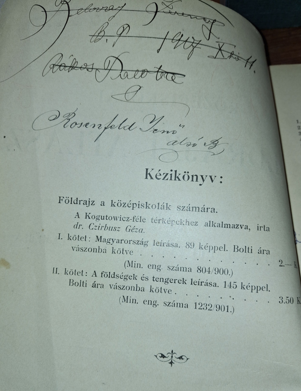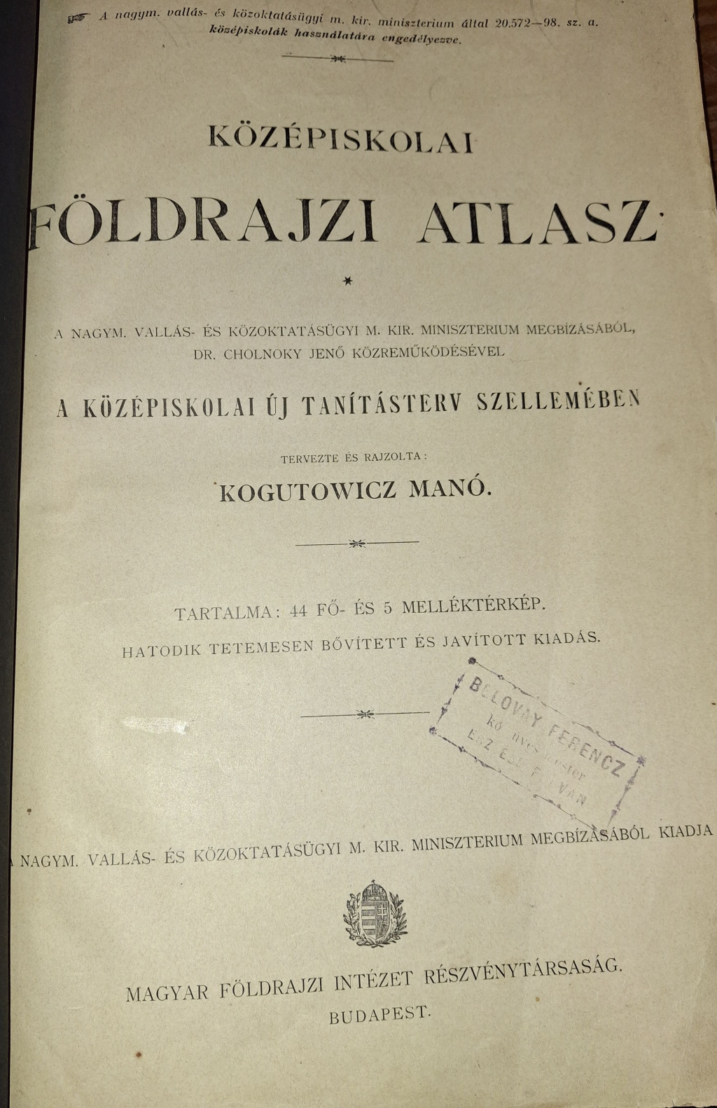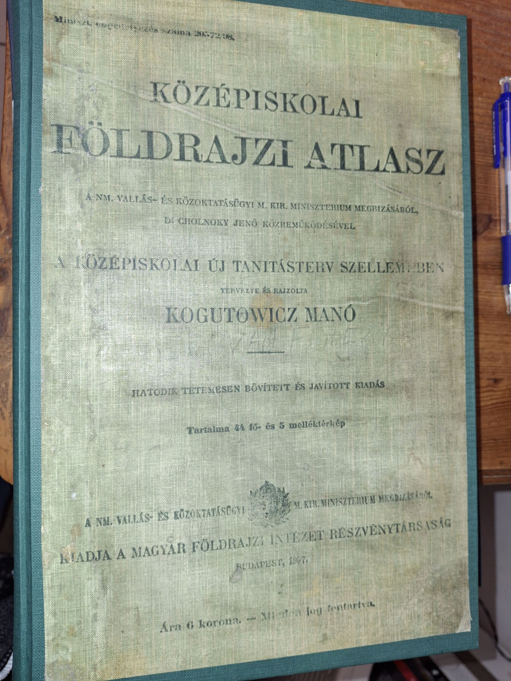 A legendás térképész, Kogutovitz Manó által tervezett és rajzolt Középiskolai Földrajzi Atlasz hatodik kiadása 1907-ből.