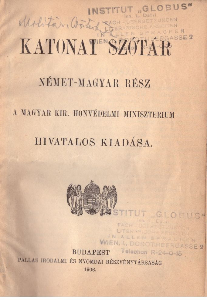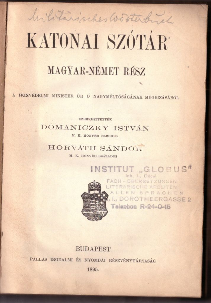 Alcím " A honvédelmi minister úr Ő Nagyméltóságának megbízásából" / A Magyar Kir. Honvédelmi Miniszterium Hivatalos KiadásaSzerző/Szerkesztő Domaniczky István honvéd ezredes, Horváth Sándor honvéd századosKiadó Pallas Irodalmi és Nyomdai Részvénytársaság - Honvédelmi MinisztériumKiadás helye BudapestKiadás éve 1895 (Magyar-Német), 1906 (Német-Magyar)Nyomda Pallas Irodalmi és Nyomdai Részvénytársaság, -budapestOldalszám 452 ;440Nyelv magyar, németKötéstípus Félvászon kötés.Állapot Jó, a gerinc könyvkötő által javított, eredeti. Előzéklapon ceruzás beírások, címlapon előző tulajdonos bélyegzője.Raktárkészlet VANCikkszám P_SZOTAR_MILITARYTömeg 805 g/db