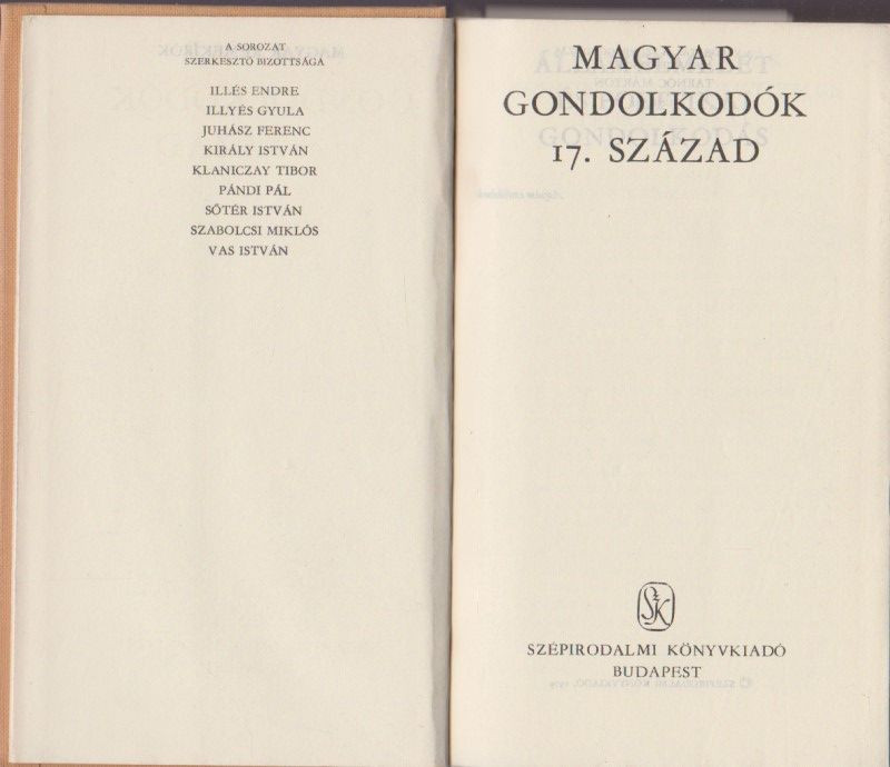 Államelmélet és politikai gondolkodás Fejedelmi trükkök. A fejedelmi abszolutizmus teoretikusai Bocskai István (1557-1606) Testamentomi rendelés (1606) 9 Draskovich János (?- 1613) Fejedelmek órájának második könyve (Grác, 1601) Ajánlás Istvánfi Éva asszonynak 23 Az asszonyemberek széjjelsétálásokrúl 27 Miképpen kellessék embernek gyermekét nevelni 32 Szepsi Korotz György (16-17.sz.) Királyi ajándék (Oppenheim 1612) Ajánlás Homonnai Istvánnak 50 Az királynak és fejedelmeknek tisztekről 58 Pataki Füsüs János (?- 1629) Királyoknak tüköre (Bártfa, 1626) Dedikáló levél Bethlen Gábornak 69 Az serénységről 75 Az okosságról 77 Prágai András (?-1636) Fejedelmeknek serkentő órája (Bártfa, 1628) Marcus Aurelius császárnak, szép jeles beszélgetése 87 Marcus Aurelius tanácsul adja fiának 96 Bethlen Gábor (1580-1629) Végrendelete (1629) 104 Vetéssi István Levél az uralkodás művészetéről I. Rákóczi György fejedelemhez (1631) 120 I. Rákóczi György (1596-1648) Fejedelmi Parainesis (1637) 133 Laskai János (1605? - 1657?) A polgári társaságnak tudományáról (Bártfa, 1641) Ajánlólevél Eperjesi Madarász Györgynek 138 A birodalom elosztása 141 Politikai publicisztika, buzdító iratok Alvinci Péter (1570-1634) Magyarország panasza (Kassa, 1620) 165 Névtelen Siralmas könyörgő levél (1656) 186 Zrínyi Miklós (1620-1664) Török áfium (1660) 240 Nádasdy Ferenc (1625-1671) Oratio az ország négy rendjéhez (1668) Bethlen Miklós (1642-1716) Olajágat viselő Noé galambja (1704) 283 II. Rákóczi Ferenc (1676-1735) Breznai Kiáltvány (1703) 296 Ráday Pál (1677-1733) II. Rákóczi Ferenc kiáltványa (1703-1704) 299 Névtelen Egy lengyel királyi tanácsosnak levele (1709) 311 II. Rákóczi Ferenc (1676-1735) Egy igaz magyarnak hazája dolgai felől való elmélkedése (1710) 378 Tudomány és művelődéspolitika Filozófia, pedagógia, művelődésügy Szenci Molnár Albert (1574-1634) Psalterium Ungaricum (Herborn, 1607) Ajánlás IV.Frigyes pflazi és Móric hesseni tartomány grófnak 389 Előszó Károlyi Gáspár Szent Bibliá-jának Hanoviai kiadásához (1608) 398 Ajánlás Móric hesseni tartománygrófnak 398 Magyar Grammatika (Hanau, 1610) Ajánlás az ifjabb Móric úrnak 406 Postilla Scultetica (Oppenheim, 1617) Ajánlás a nagyszombati eklézsiának 422 Kálvin: A keresztyéni religióra és az igaz hitre való tanítás (Hanau, 1624) 431 Dedikáló levél Bethlen Gábor fejedelemnek 431 Tudósítás az Calvinus hivataláról 436 Emlékeztető beszéd 438 Az Istennek esméretiről 441 Mi legyen az Istent igazán megesmérni 445 Hogy az Istennek esméreti természetű legyen 450 Az toldalékokról 454 Az örök elválasztásról 454 Discursus de summo bono (Lőcse, 1630) Ajánlás Darhlocz Ferencnek 469 Ez világnak sokféle jovairól 474 Hogyha azért ez ilyen gyönyörűségekben igaz boldogság és vallásos öröm találtassék-é? 486 Rimay János (1570 k. - 1631) Balassi Bálint apológiája 493 Előszó Balassi Bálint verseinek kiadásához 503 Értekező levél 510 Mikolai Hegedűs János (1617-1667) Biblia tanúi (Utrecht, 1648) 524 Az mennyei igazságnak tüzes oszlopa (Utrecht, 1648) Ajánlás Kaposfalui Pál és Szentpéteri János Uraimnak 526 Az istenes olvasónak 529 Laskai János (1605-1657?) Az állhatatosságról (Bártfa, 1641) Ajánlólevél Vay Péternek 535 Elöljáróbeszéd és bévitel az állhatatosságra 542 Kéri Sámuel (?-1671) Keresztyény Seneca (Bécs, 1654) 558 Apácai Csere János (1625-1659) A bölcsesség tanulásáról (1653) 609 Magyar Enciklopédia (Utrecht, 1655) Előszó 656 A tudománynak kezdeteiről 679 A földi dolgokról 683 Lippai János (1606-1666) Pozsonyi kert (Nagyszombat-Bécs, 1664) Ajánlólevél 716 Az Kegyes Olvasóhoz 719 Virágoskert 723 Veteményeskert 738 Gyümölcsöskert 748 Pápai Páriz Ferenc (1649-1716) Pax corporis (Kolozsvár, 1690) Elöljáró beszéd 754 A főfájásról 760 A főszédelgésről 764 A reszketegségről 767 A kórságról 772 Tótfalusi Kis Miklós (1650-1702) Előszó a Zsoltárok 1686.os kiadásához 779 Apologia Bibliorum (Kolozsvár, 1679) Előjáró beszéd 783 Védekező levél 788 Történetírás Szalárdi János (1601-1666) Siralmas magyar krónikáknak kilenc könyvei (1662-1664) Várad megszállása, ostroma, eleste 807 Bethlen János (1613-1678) Rerum Transylvanicarum libri IV. (Szeben, 1663) Kemény János fejedelemsége 878 Medgyesi Pál (1615-1663) Erdély romlásának okairól 922 Diószegi Bónis Mátyás (1622-?) Az részegesnek gyülölséges, utálatos, és rettenetes állapotja (Leyden, 1649) 957 Petrityvity-Horváth Kozma (1634-1668 után) Önéletírás (1668) II. Rákóczi György erdélyi fejedelem lengyelországi hadjárata 1039 Cserei Mihály (1667/68-1756) Históriája (1661-1711) 1061 Útleírás Zalánkeményi Kakas István (?-1603) Iter Persicum (Meissen, 1609) Moszkva leírása 1087 Szepsi Csombor Márton (1595-1622) Europica varietas (Kassa, 1620) Előszó 1095 Udvari schola (1623) 1098 Borsos Tamás (1566-1634) Itnerarium ad fulgidam portam otthomanicam (1614) 1130 Egyiptusról (1620) 1144 Bezérdy Zsigmond (1638-?) Itáliai utazás (1665) 1151 Rozsnyai Dávid (1641-1718) Kréta és görög szigetek leírása (1669-70) 1156 Névtelen Konstantinápoly városnak rövid leírása (1688) 1161 Jegyzetek 1171 Utószó 1263