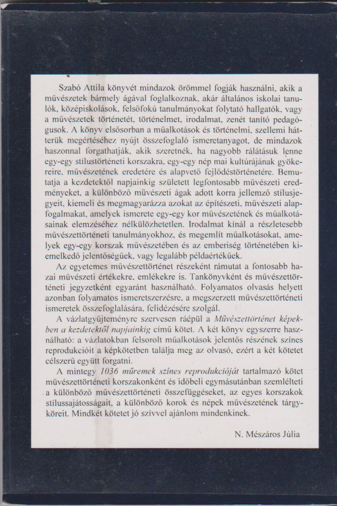 A mintegy 1036 műremek színes reprodukcióját tartalmazó kötet művészettörténeti korszakonként és időbeli egymásutánban szemlélteti a különböző művészettörténeti összefüggéseket, az egyes korszakok stílussajátosságait, a különböző korok és népek művészetének tárgyköreit. Mindkét kötetet jó szívvel ajánlom mindenkinek.