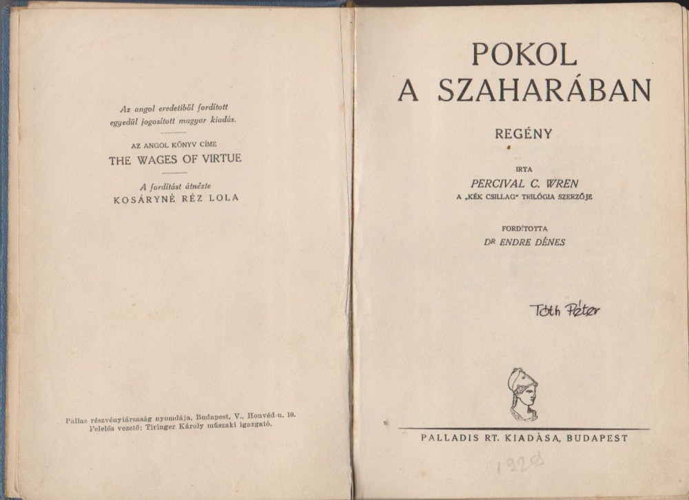 Szerző/Szerkesztő Percival C. WrenKiadó Palladis Rt. KiadásaKiadás helye BudapestFordító Dr. Endre DénesNyomda Pallas részvénytársaság nyomdájaOldalszám 312Nyelv magyarKötéstípus vászonÁllapot jó, a belső címoldalon a korábbi tulajdonos nevének beírása láthatóRaktárkészlet VANCikkszám P7_5_POKSZAHTömeg 384 g/db