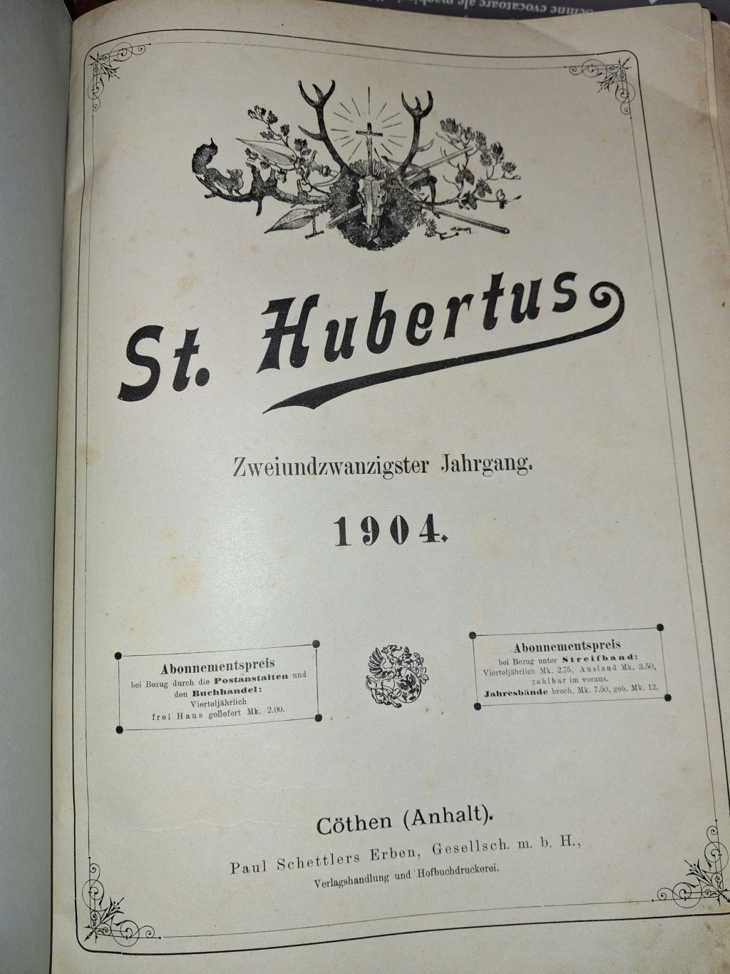 Alcím 22. évfolyam, 1904.Kiadó Paul Schettlers Erben, Gesellsch. m. b. H.Kiadás helye Cöthen/AnhaltKiadás éve 1904Sorozat St. HubertusNyomda Paul Schettlers Erben, Gesellsch. m. b. H.Oldalszám 714Nyelv NémetKötéstípus Könyvkötő által újrakötve a gerincc (bőr), a kötéstábla az eredeti vászon, aranyozott nyomatokkal.Állapot Jó, lapszélek könyvkötő által javítva, hiánytalan. A borítón kisebb kopások és foltok találhatóak.Raktárkészlet VANCikkszám P5_6_HubertusTömeg 4,1 kg/db