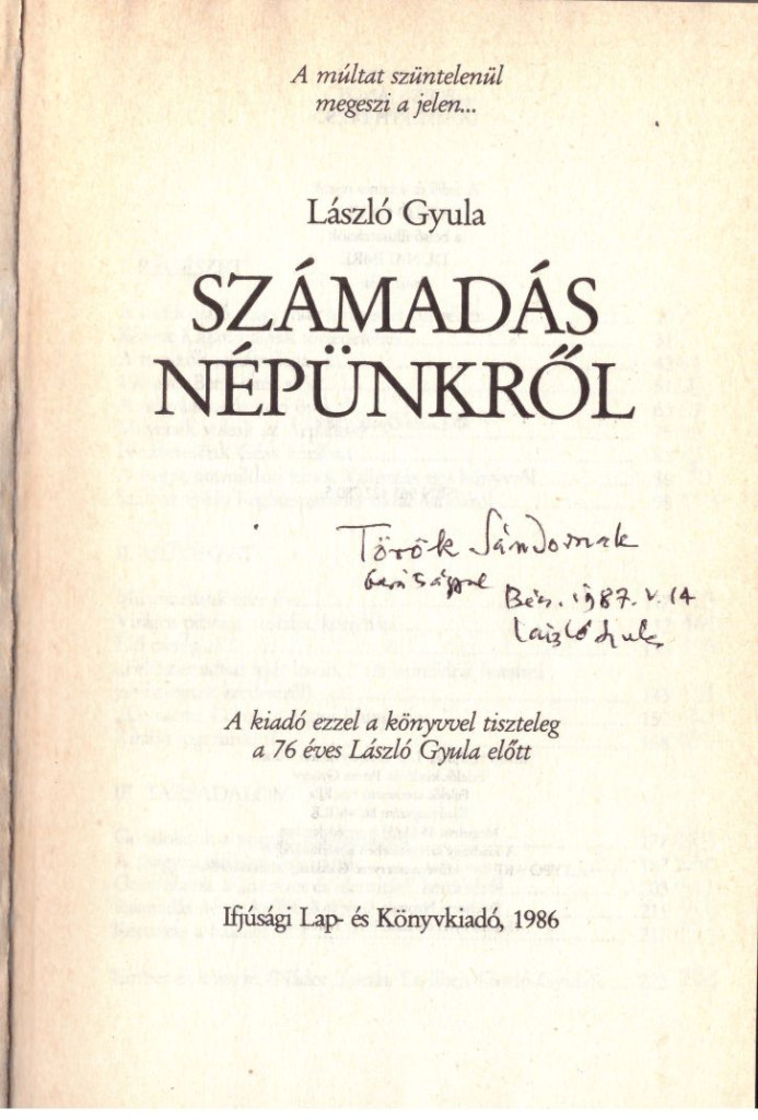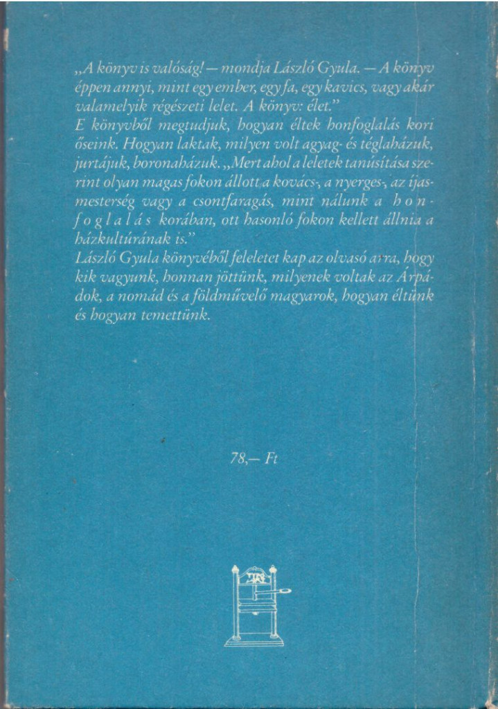 „A könyv is valóság! – mondja László Gyula. – A könyv éppen annyi, mint egy ember, egy fa, egy kavics, vagy akár valamelyik régészeti lelet. A könyv: élet.” E könyvből megtudjuk, hogyan éltek honfoglalás kori őseink. Hogyan laktak, milyen volt agyag- és téglaházuk, jurtájuk, boronaházuk. „Mert ahol a leletek tanúsítása szerint olyan magas fokon állott a kovács-, a nyerges, az íjasmesterség vagy a csontfaragás, mint nálunk a honfoglalás korában, ott hasonló fokon kellett állnia a házkultúrának is.” László Gyula könyvéből feleletet kap az olvasó arra, hogy kik vagyunk, honnan jöttünk, milyenek voltak az Árpádok, a nomád és a földművelő magyarok, hogyan éltünk és hogyan temettünk."