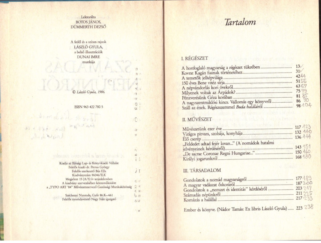 A tartalomjegyzékben található oldalbeosztás helytelen, az előző tulajdonos ceruzával melléírta a helyeset.